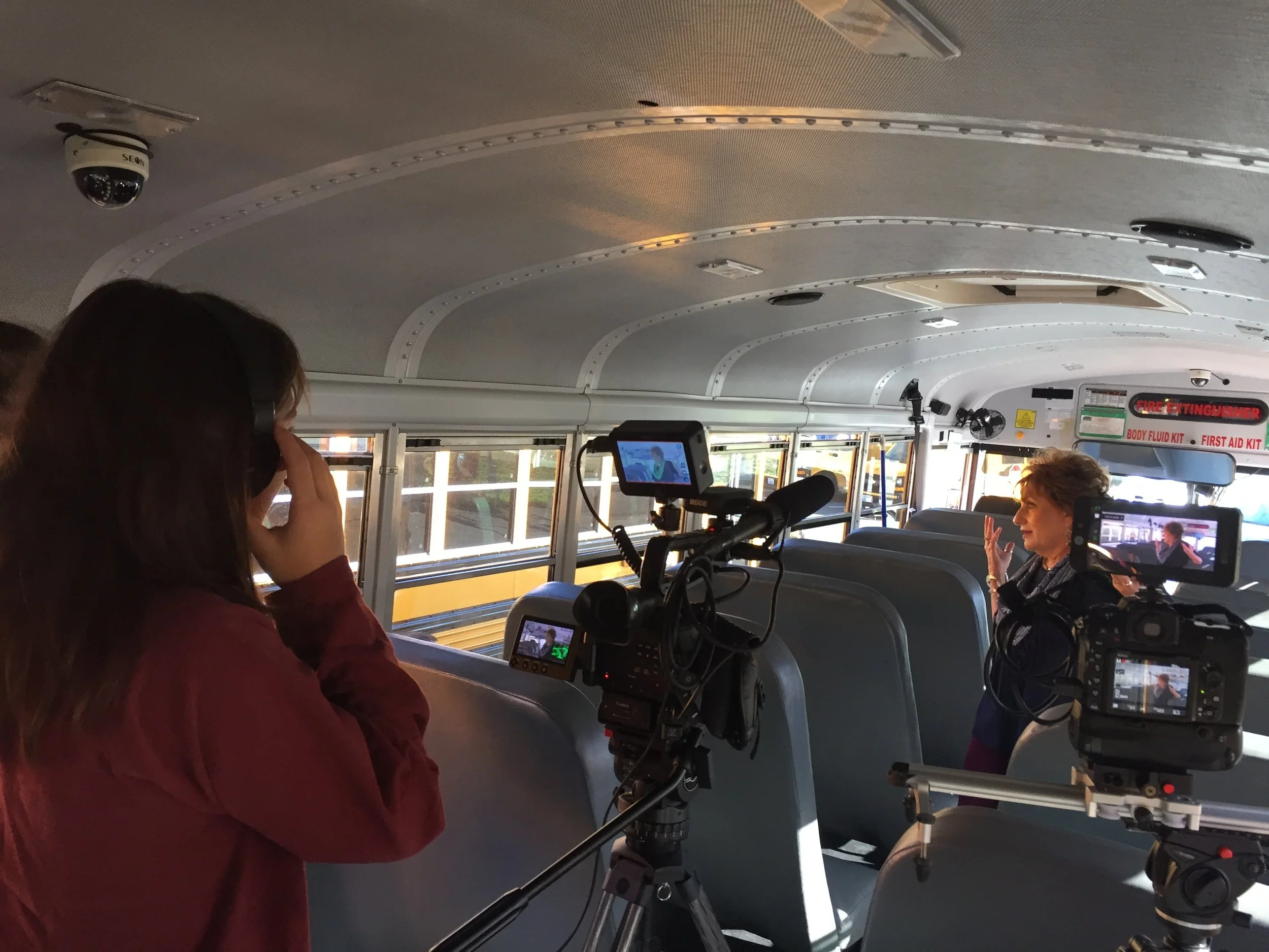 The second day was all interviews. Again we found ourselves rushing around (as is to be expected during filming days). We were even set up inside a bus for one! Though throughly an odd set-up, I personally found it a cool spot!