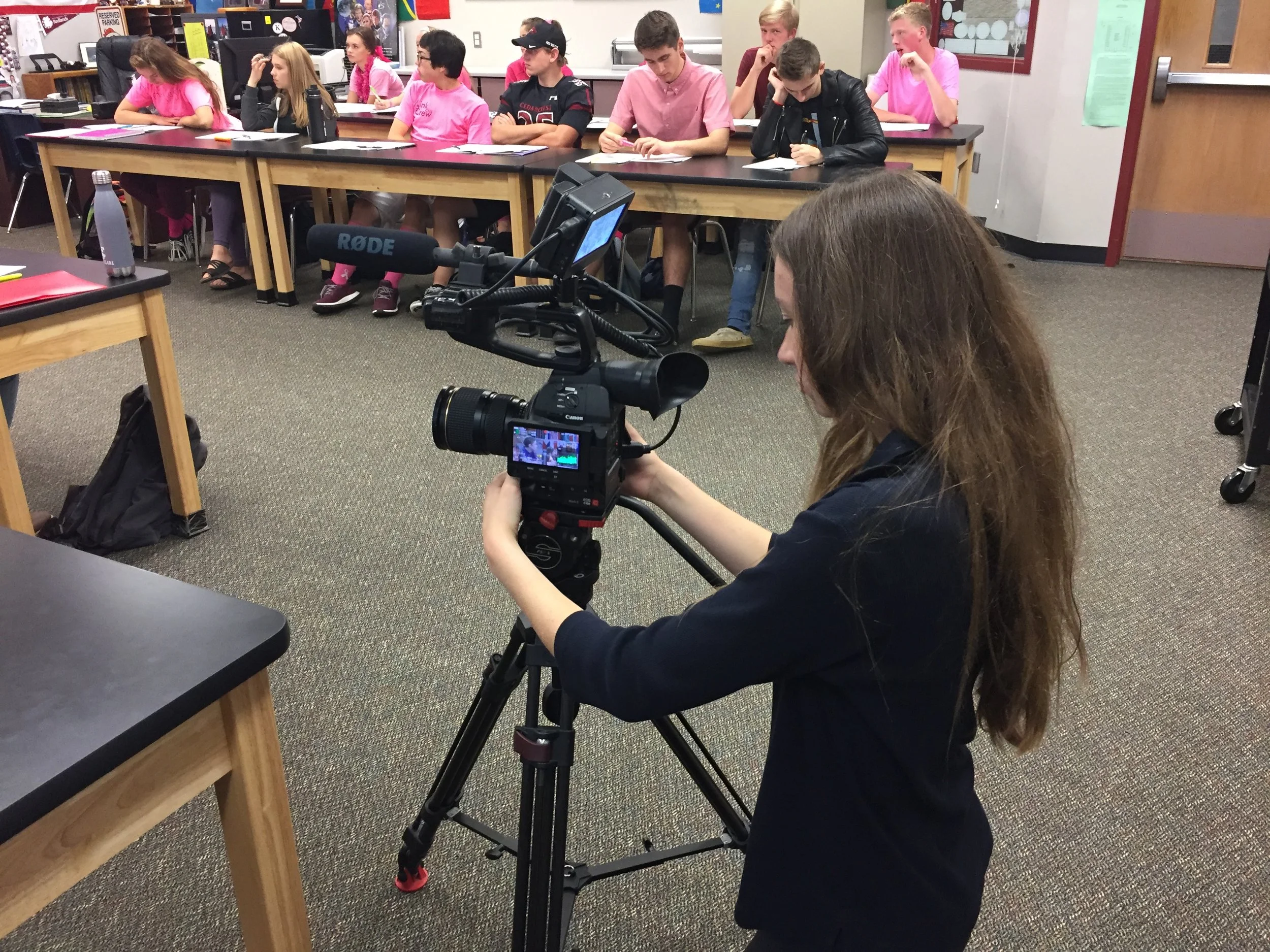 Taylor filming inside a classroom.