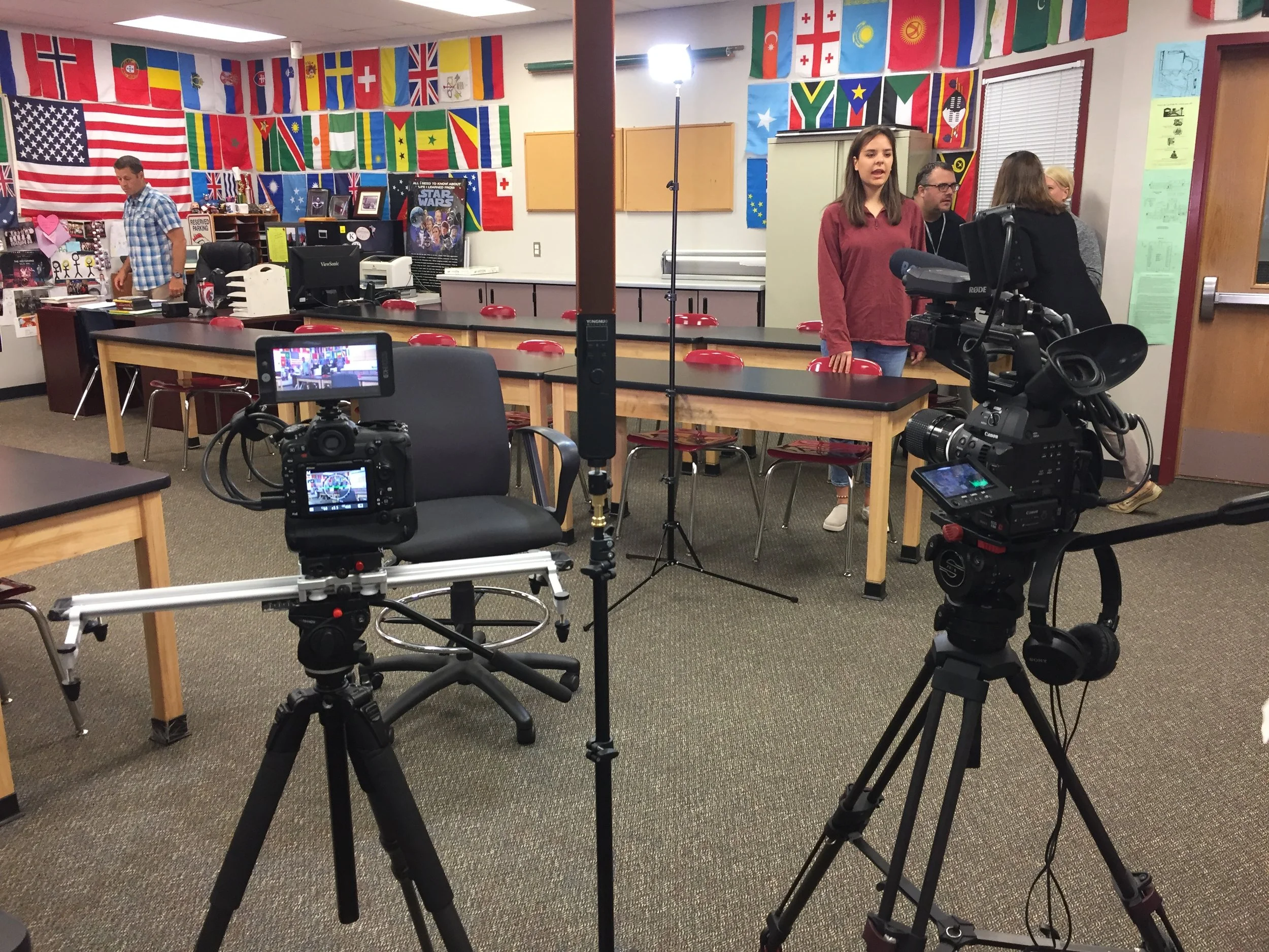 The first day we focused on Broll. We went from classroom to classroom filming students working, teachers lecturing, and even a dissection of a giant worm and grass hopper (that was a treat). We traveled between 4 schools that day - 2 elementary, the middle and high school.