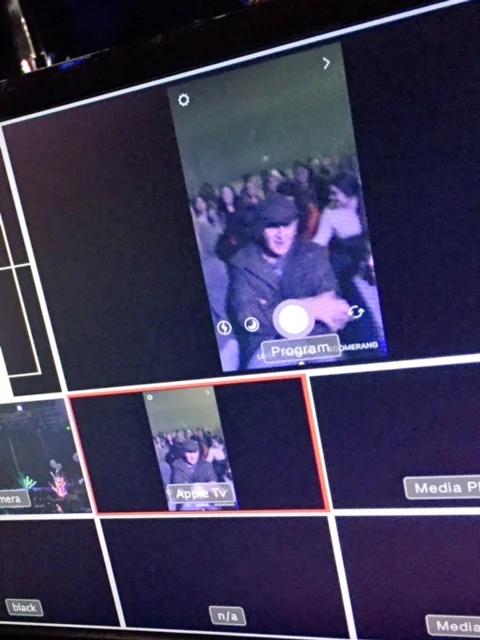 One of the other event techs (the lighting designer actually) had the ingenious idea of using an iPod to act as the mobile camera by routing the phone display through an Apple TV device. This provided an interesting effect, giving those not close to the action a more organic interaction. Instead of a camera zoomed in, they got to see through a phone that was right there in the heart of the action Plus, it was awesome having someone with such a small device run around and capture great footage.